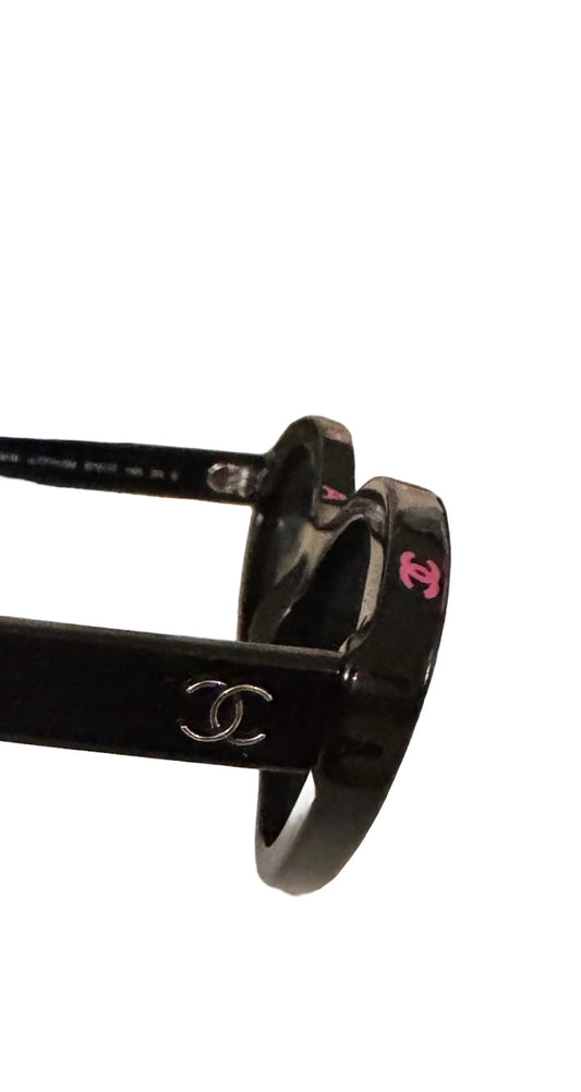CHANEL Oval Sunglasses – Black with Pink Lettering (Pre-Loved)
