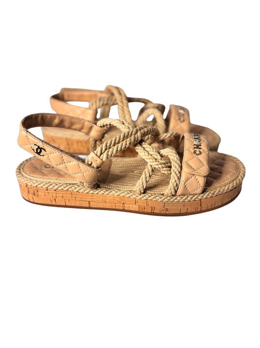Chanel Cord Lambskin Quilted Logo Sandals in beige Sz41 (Preowned)