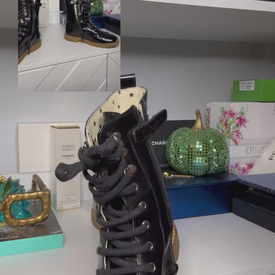 Elevate your little fashionista’s wardrobe with these authentic Gucci girls combat boots. Crafted in glossy black leather, these statement boots feature a rugged lug sole, lace-up front, and iconic Gucci detailing—perfect for stylish everyday wear or standout fall and winter looks.