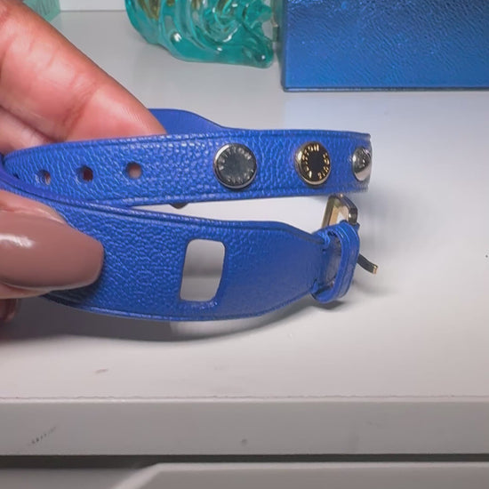 This vibrant Louis Vuitton bracelet is perfect for stacking or wearing solo for a statement finish. Its mix of metallic accents adds a chic contrast to the vivid blue leather, making it a standout addition to any luxury jewelry or accessory collection.